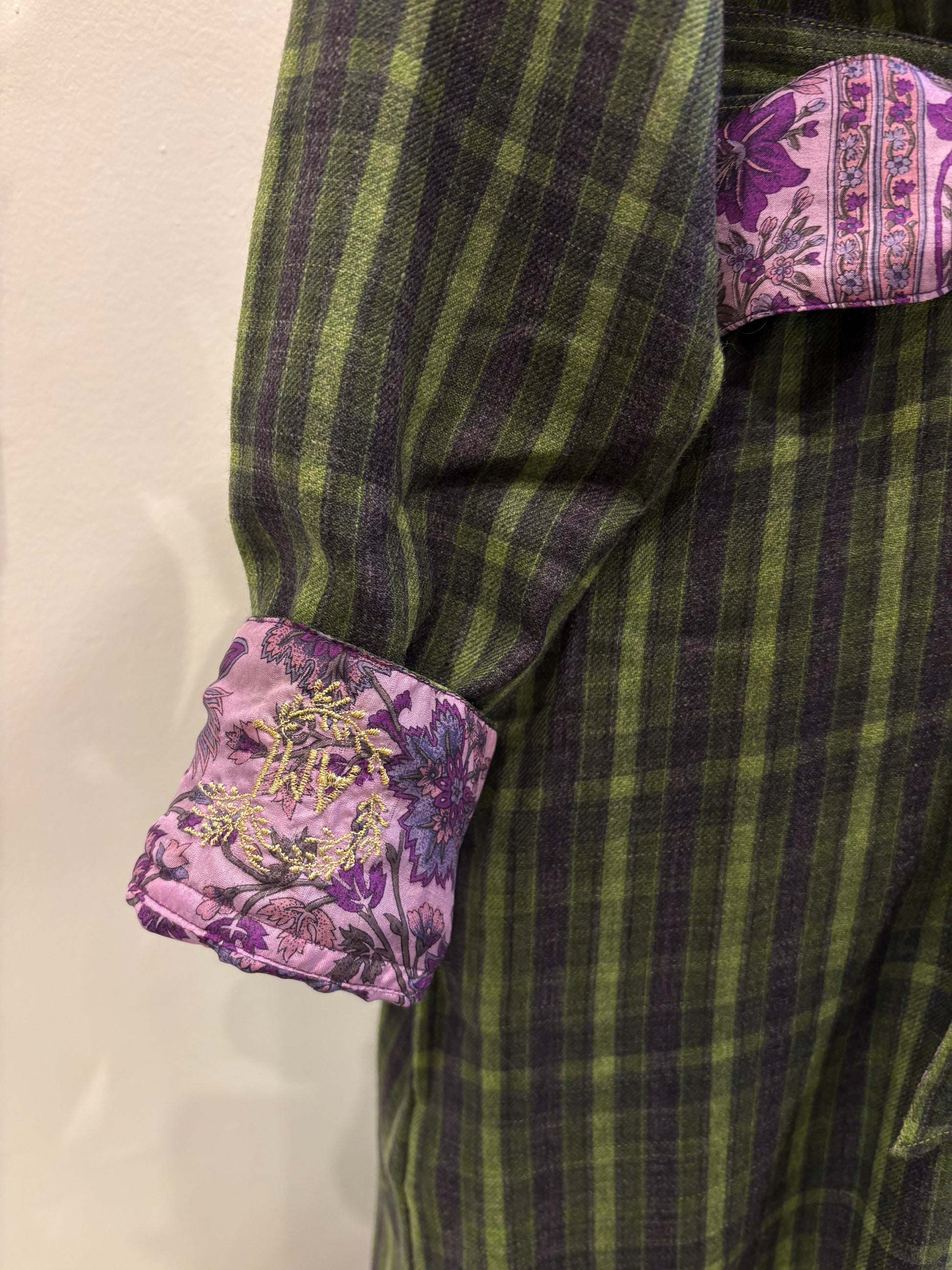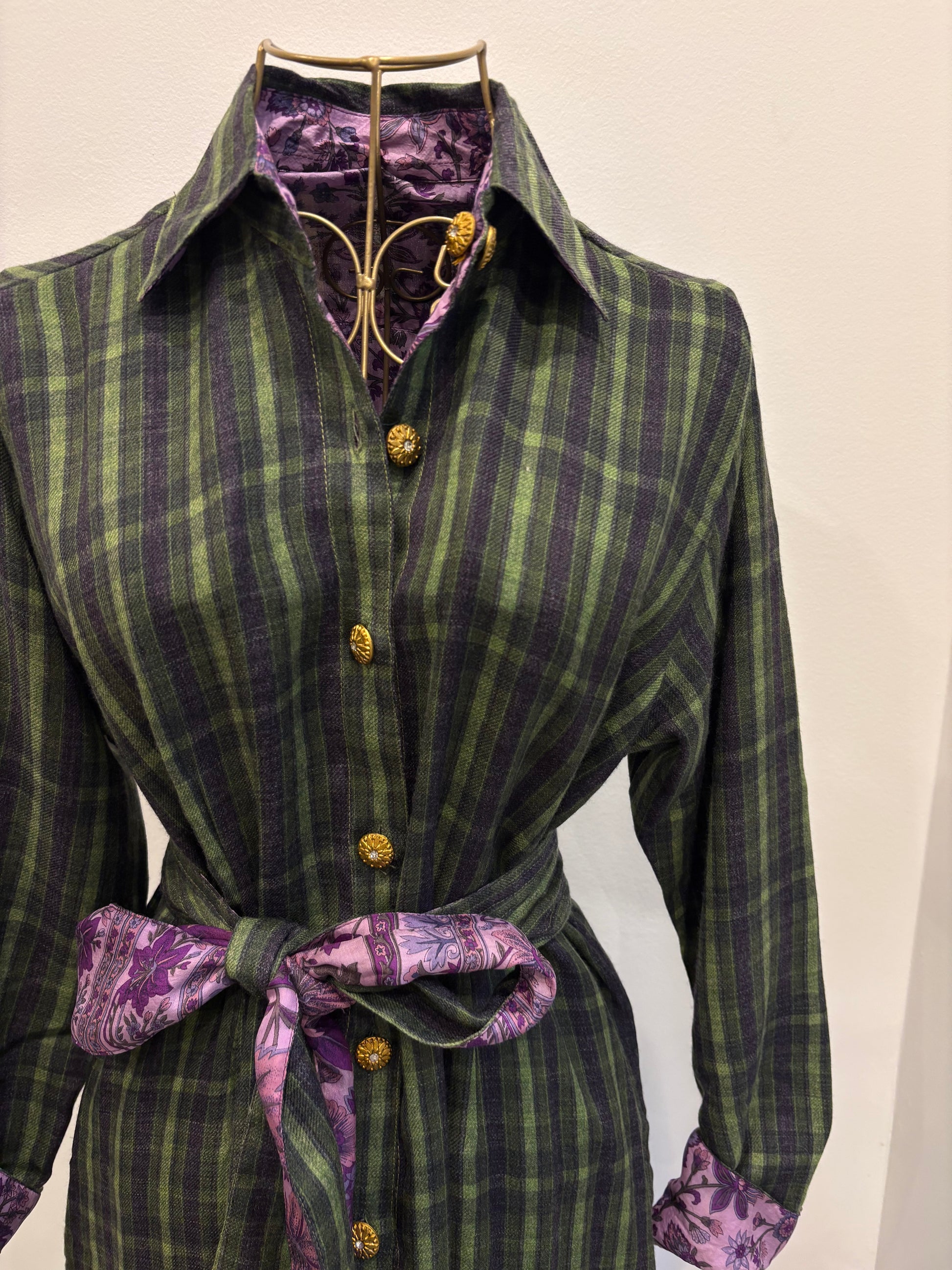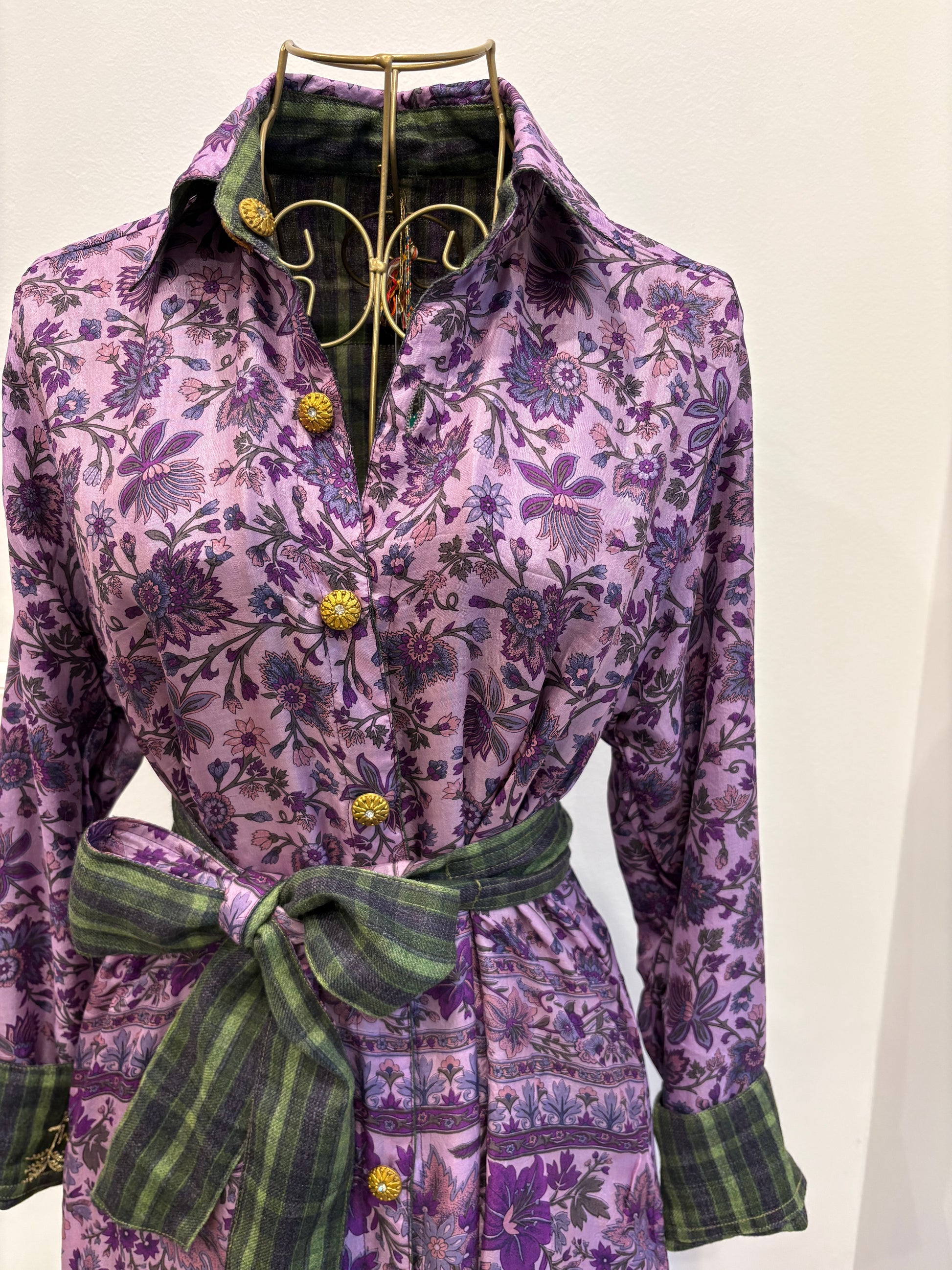 Robe longue chemisier réversible réalisée à partir de sari de soie ancien et de laine.