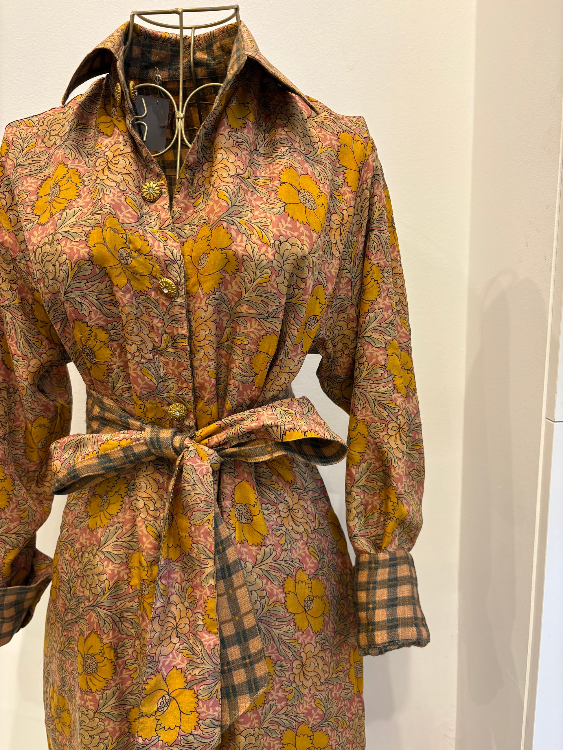 Robe longue chemisier réversible réalisée à partir de sari de soie ancien et de laine.